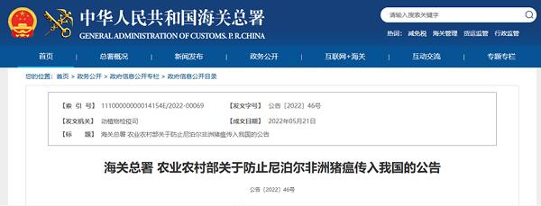 據(jù)海關(guān)總署網(wǎng)站5月31日消息,海關(guān)總署、農(nóng)業(yè)農(nóng)村部日前發(fā)布關(guān)于防止尼泊爾非洲豬瘟傳入我國的公告稱,2022年5月18日,尼泊爾向世界動物衛(wèi)生組織(OIE)緊急報(bào)告,3月19日至4月14日,該國巴格馬蒂?。˙agmati)6家農(nóng)場發(fā)生非洲豬瘟,涉及的易感動物有1426頭家豬,其中1364頭發(fā)病,934頭死亡。5月19日,世界動物衛(wèi)生組織(OIE)已確認(rèn)尼泊爾出現(xiàn)首例非洲豬瘟,并成為第16個(gè)發(fā)生非洲豬瘟疫情的亞洲國家。