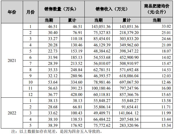 2022年1-5月銷售商品豬176.92萬頭(其中仔豬銷售21,045頭),銷售收入283,320.96萬元,銷售均價(jià)13.24元/公斤(商品肥豬均價(jià)為13.38元/公斤),同比變動(dòng)分別為15.49%、-28.88%、-52.90%。