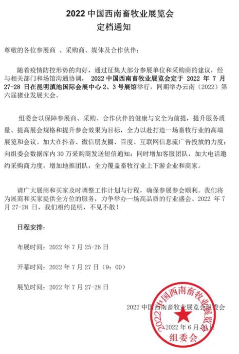隨著疫情防控形勢的向好,通過征集大部分參展單位和采購商的建議,經(jīng)與相關(guān)部門和場館溝通協(xié)調(diào), 2022中國西南畜牧業(yè)展覽會定于 2022 年 7 月27-28 日在昆明滇池國際會展中心2、3號館舉行,同期舉辦云南(2022)第六屆豬業(yè)發(fā)展大會。