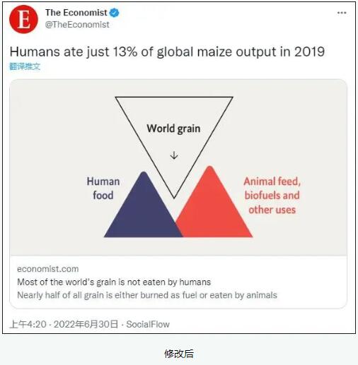 此外,《經(jīng)濟(jì)學(xué)人》于6月30日重新發(fā)布了一篇推文,重新摘取了文章中另一句原文:“2019年人類僅吃掉了全球玉米產(chǎn)量的13%”。