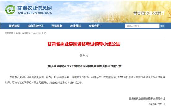 甘肅農(nóng)業(yè)信息網(wǎng)7月11日消息,蘭州市所屬四區(qū)因新冠肺炎疫情,自7月11日起實(shí)施為期一周臨時(shí)管控措施,經(jīng)請示農(nóng)業(yè)農(nóng)村部同意,2022年甘肅考區(qū)全國執(zhí)業(yè)獸醫(yī)資格考試延期舉行。