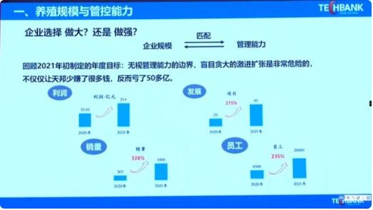 張邦輝坦言,2021年天邦年初制定目標(biāo)出現(xiàn)問題,這一年的快速擴(kuò)張是不合理的。人才的儲(chǔ)備培養(yǎng)不夠, 技術(shù) 能力遠(yuǎn)遠(yuǎn)落后于產(chǎn)能,管理效能不足 , 不能滿負(fù)荷生產(chǎn)又造成了資產(chǎn)浪費(fèi)和成本上升……這些問題使得這次擴(kuò)張沒有為天 邦食品帶來理想收益,反而讓天邦食品虧了50多億。