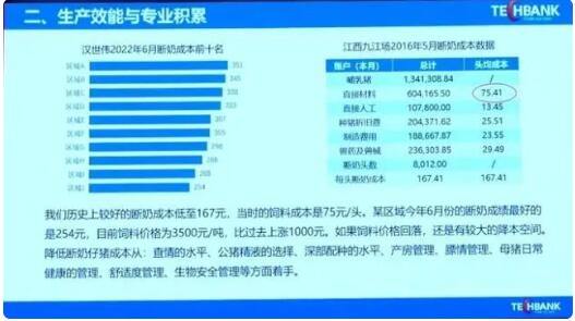 天邦食品歷史上較好的斷奶成本低至167元/頭,今年正常斷奶仔豬成本已降到300元/頭,6月某區(qū)域最好的斷奶成本是254元/頭。