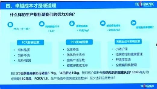 張邦輝也透露了天邦食品長期的生產(chǎn)指標(biāo)目標(biāo)。天邦食品雄心勃勃,未來將挑戰(zhàn)PSY35,飼料系數(shù)FCR小于2.2,育肥全成本小于10元/公斤,斷奶仔豬成本小于200元/頭。