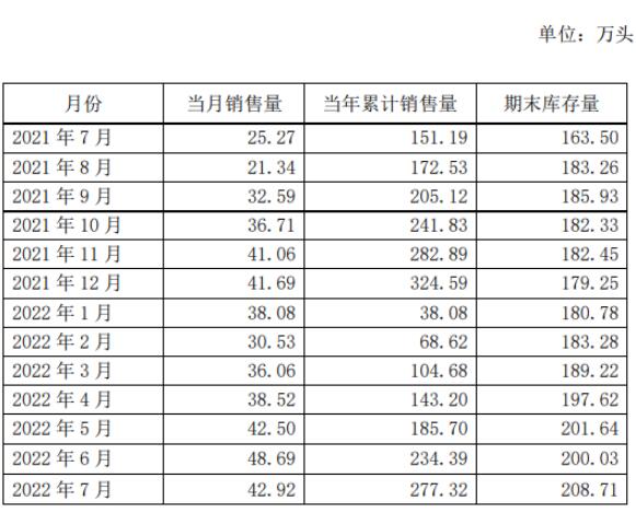 2022年1-7月,公司累計(jì)銷(xiāo)售生豬277.32萬(wàn)頭,銷(xiāo)售量同比增長(zhǎng)83.42%。
