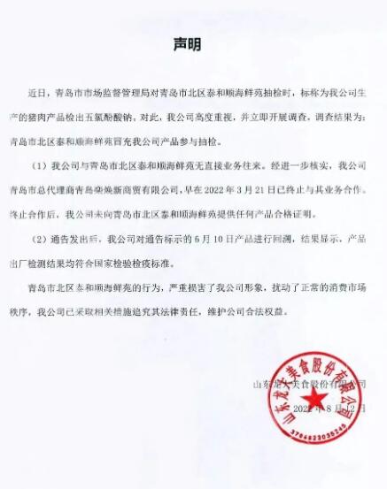 隨后,龍大美食在官網(wǎng)發(fā)聲明稱,是泰和順冒充其產(chǎn)品參與抽檢,而通告標(biāo)示的6月10日產(chǎn)品,其出廠檢測(cè)結(jié)果均符合國(guó)家檢驗(yàn)檢疫標(biāo)準(zhǔn)。