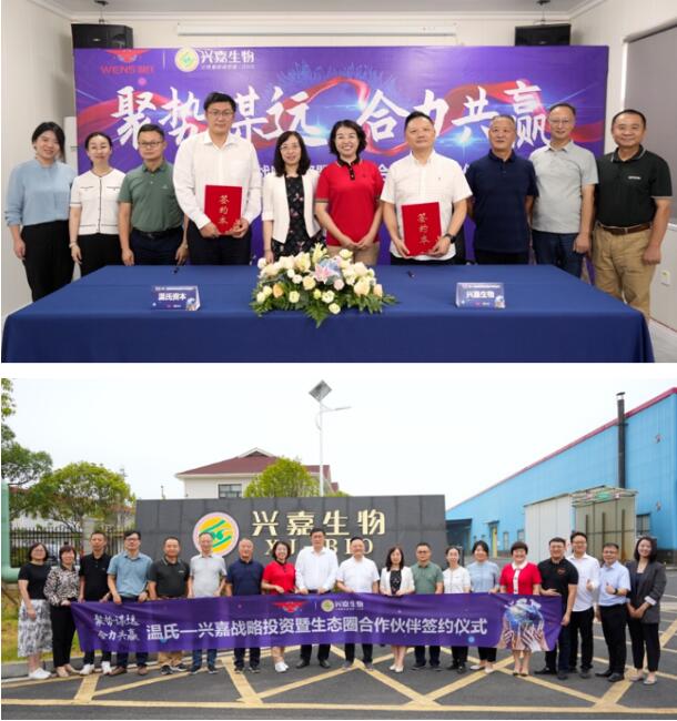 在簽約儀式上,溫氏股份董事兼溫氏投資總裁趙亮、溫氏股份總裁助理采購中心總經(jīng)理孫芬、溫氏股份技術(shù)部執(zhí)行總經(jīng)理譚會澤、溫氏股份采購中心副總經(jīng)理徐丹丹、溫氏投資執(zhí)行總經(jīng)理陳露,興嘉生物董事長黃逸強、興嘉生物總經(jīng)理向陽葵、興嘉生物CTO張維軍、興嘉生物技術(shù)副總裁匡自修、興嘉生物產(chǎn)品總監(jiān)張亞偉、興嘉生物營銷副總經(jīng)理向紅兵、興嘉生物股東代表陳曉明出席并見證簽約儀式。溫氏股份董事兼溫氏投資總裁趙亮、興嘉生物董事長黃逸強代表雙方簽署戰(zhàn)略投資暨生態(tài)圈合作伙伴協(xié)議。
