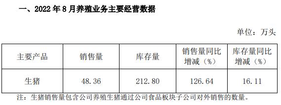 2022年1-8月,公司累計(jì)銷售生豬325.68萬(wàn)頭,銷售量同比增長(zhǎng)88.76%。