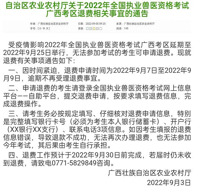 9月3日,廣西發(fā)布通告稱,受疫情影響,2022年全國執(zhí)業(yè)獸醫(yī)資格考試廣西考區(qū)延期至9月25日舉行,無法參加考試的考生可申請退費(fèi)。