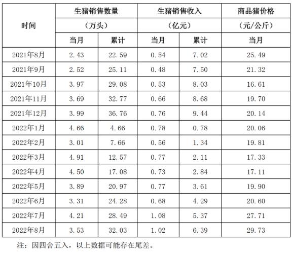 東瑞股份9月7日公布2022年8月份生豬銷售簡報。2022年8月份,公司共銷售生豬3.53萬頭,其中商品豬2.80萬頭、仔豬0.65萬頭、淘汰種豬0.09萬頭,銷售收入1.02億元,環(huán)比下降5.81%。