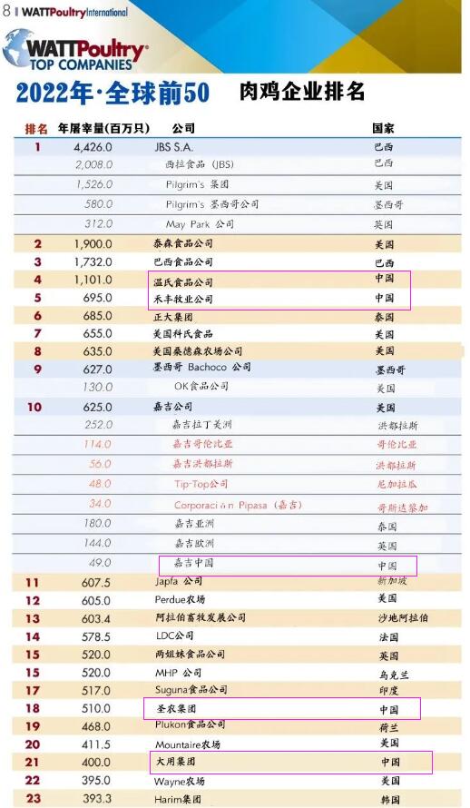 2022全球TOP家禽生產(chǎn)企業(yè)排行榜出爐!溫氏、禾豐、圣農(nóng)等企業(yè)上榜