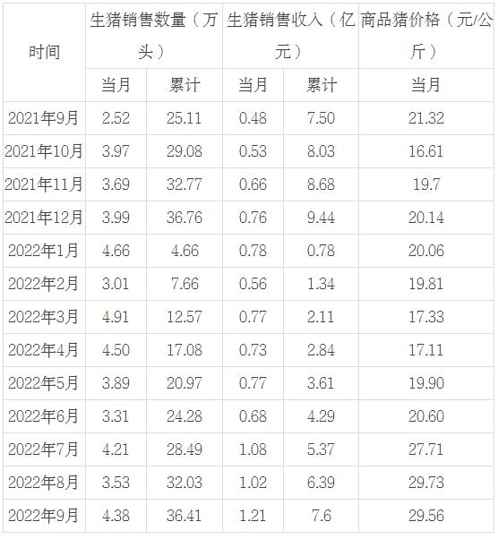2022年9月份,公司商品豬銷售均價29.56元/公斤,環(huán)比下降0.54%。