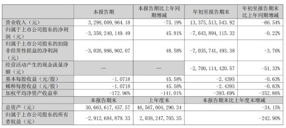 前三季度實(shí)現(xiàn)營業(yè)收入133.76億元,同比降66.54%;歸屬于上市公司股東的凈利潤為-76.44億元,同比降0.22%。