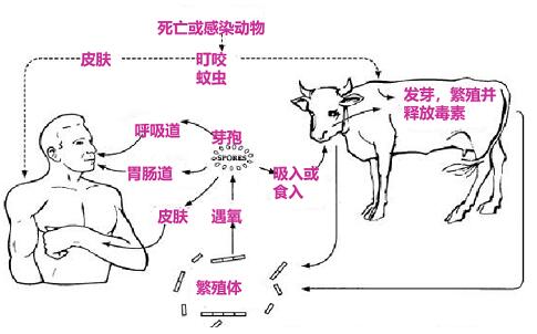 牛、羊等食草動物是炭疽的易感動物和主要傳染源。人主要通過接觸炭疽病畜、毛皮和食肉感染,也可通過吸入含有炭疽芽孢的粉塵或氣溶膠感染。當前皮膚炭疽是最為常見的感染類型,及時治療一般預后良好。肺炭疽和腸炭疽目前發(fā)病非常少,但病死率非常高。
