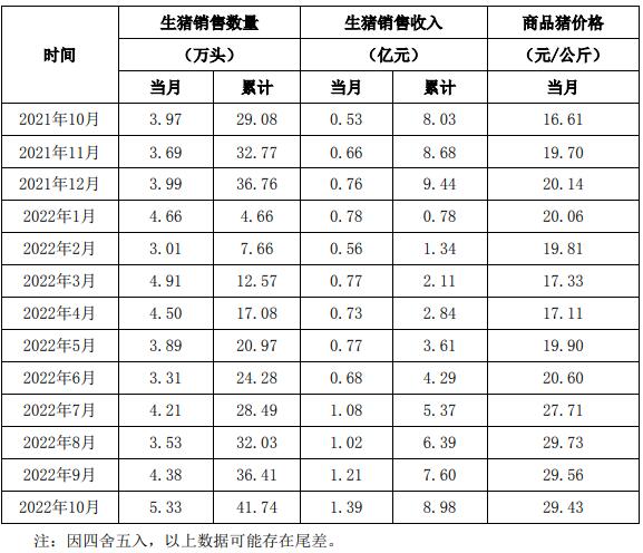 2022年10月份,公司商品豬銷售均價(jià)29.43元/公斤,環(huán)比下降0.47%。