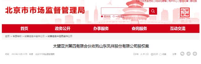太盟亞洲第四有限合伙控制的關聯方Falcon Holding LP擬通過司法拍賣收購占山東鳳祥股份有限公司(“山東鳳祥”)總股本70.92%的股份。山東鳳祥主要從事生雞肉制品及深加工雞肉制品的生產及銷售業(yè)務。交易前,新鳳祥控股集團有限責任公司持有占山東鳳祥總股本70.92%的股份,單獨控制山東鳳祥。交易后,太盟亞洲第四有限合伙將持有占山東鳳祥總股本70.92%的股份并單獨控制山東鳳祥。