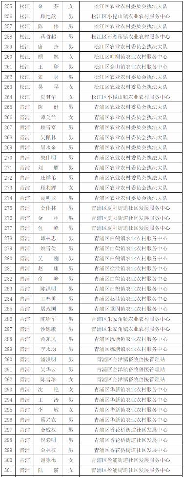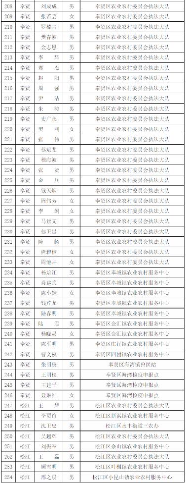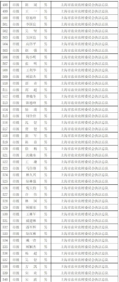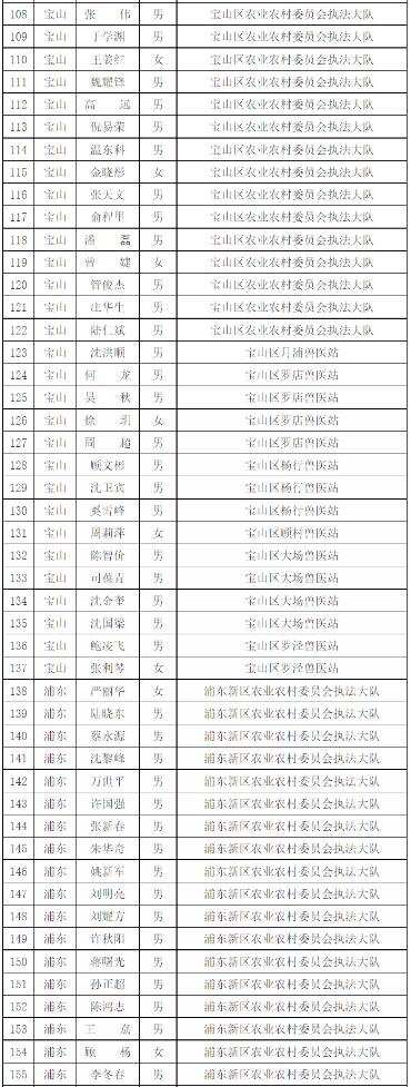 為進(jìn)一步做好本市官方獸醫(yī)(含漁業(yè)官方獸醫(yī))資格管理,加強(qiáng)隊(duì)伍建設(shè),根據(jù)《中華人民共和國(guó)動(dòng)物防疫法》《農(nóng)業(yè)部關(guān)于做好動(dòng)物衛(wèi)生監(jiān)督執(zhí)法人員官方獸醫(yī)資格確認(rèn)工作的通知》《農(nóng)業(yè)部辦公廳關(guān)于官方獸醫(yī)資格確認(rèn)條件的函》《農(nóng)業(yè)農(nóng)村部關(guān)于全面推進(jìn)實(shí)施水產(chǎn)苗種產(chǎn)地檢疫制度的通知》和《農(nóng)業(yè)農(nóng)村部辦公廳關(guān)于開(kāi)展動(dòng)物檢疫監(jiān)督能力提升行動(dòng)的通知》的要求,我委組織開(kāi)展了2022年度本市官方獸醫(yī)資格確認(rèn)工作。經(jīng)單位填報(bào)、區(qū)級(jí)復(fù)核、我委審查,擬確認(rèn)以下565人具有官方獸醫(yī)資格,現(xiàn)公示如下: