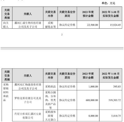 關(guān)聯(lián)交易內(nèi)容包括采購豬腸衣、采購分割肉、分體肉、骨類及副產(chǎn)品等、采購液體濃縮大豆蛋白、采購父母代雞苗、采購PVDC 樹脂。也包括銷售豬毛腸等、銷售水電汽等,提供房產(chǎn)、車輛和寫字樓租賃等、接受運(yùn)輸勞務(wù),提供商標(biāo)使用及推廣宣傳許可。