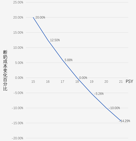 豬場成本有很多因素構(gòu)成,財會也有很多計算成本的方法如均攤成本、落地成本等。但大體上可分為固定成本和可變成本,可從廣義上區(qū)分固定成本和可變成本,基本固定不變的成本稱之為固定成本,如母豬每年消耗的飼料、設(shè)備折舊、基因更新成本等;而很容易發(fā)生變化的成本稱之為可變成本,如防疫成本、勞動力成本、營銷成本等。在PSY為18時,提高或降低PSY對成本的影響,詳見下圖。