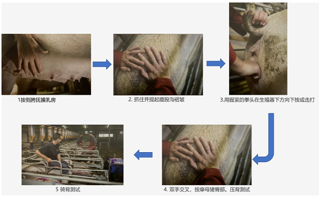使用公豬通過嗅覺、聽覺、視覺對母豬進行刺激,所用公豬為10月齡以上公豬且性欲旺盛,每天在固定的時間進行查情,每天兩次。如有可能可以同時使用兩頭公豬。