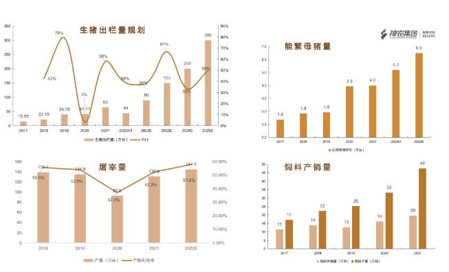 養(yǎng)殖板塊:2022年生豬出欄預(yù)計(jì)超過(guò)90萬(wàn)頭,2023年、2024年、2025年規(guī)劃生豬目標(biāo)出欄分別為150萬(wàn)頭、200萬(wàn)頭、300萬(wàn)頭。蔣宏表示,為保證2023年150萬(wàn)頭出欄目標(biāo)的實(shí)現(xiàn),2022年年底公司能繁母豬計(jì)劃擴(kuò)充到6.5萬(wàn)頭;此外,為保證2025年300萬(wàn)的出欄量,今明兩年神農(nóng)集團(tuán)將增加10萬(wàn)頭母豬,資產(chǎn)投資約為13億元。