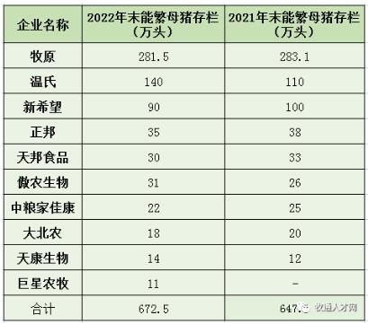 與2021年同期相比,目前能繁母豬存欄超百萬(wàn)頭的企業(yè)只有牧原、溫氏2家,其中,牧原股份以年末能繁母豬存欄281.5萬(wàn)頭的成績(jī)遙遙領(lǐng)先,盡管略低于2021年283.1萬(wàn)頭的水平,但依然保持了斷層第一。