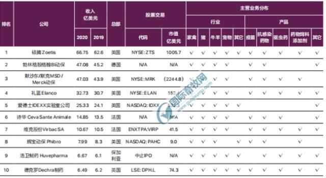 從前 10 強(qiáng)企業(yè)來看,總部均設(shè)在歐美,美國占一半。2020年,這10家企業(yè)市場(chǎng)份額占比58.50%,較2019年的55.57%增加約3個(gè)百分點(diǎn),位次順序大致未變(除浩衛(wèi)制藥晉級(jí)第9位、詩華、維克各前進(jìn)1位外),以及禮藍(lán)在2020年8月1日完成對(duì)拜耳動(dòng)保的收購,其2020年收入略增但排名未變。