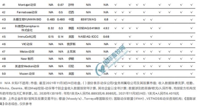 十家中國企業(yè)入圍,分別為:中牧股份(2020年收入為3.55億美元)、瑞普生物(2020年收入為2.90億美元)、易邦生物(2020年收入為2.55億美元)、齊魯動(dòng)保(2020年收入為2.34億美元)、金宇生物(2020年收入為2.29億美元)、魯抗醫(yī)藥(2020年收入為1.96億美元)、金河生物(2020年收入為1.80億美元)、普萊柯(2020年收入為1.35億美元)、海正藥業(yè)(2020年收入為1.06億美元)、永順生物(2020年收入為0.483億美元)。這10家企業(yè)2020年收入總計(jì)20.29億美元。根據(jù)中國獸藥協(xié)會(huì)公布的數(shù)據(jù),2020年國內(nèi)獸藥產(chǎn)品銷售規(guī)模為620.95億元。粗略估計(jì),中國動(dòng)保前十企業(yè)收入約占全國獸藥產(chǎn)品收入20.83%。
