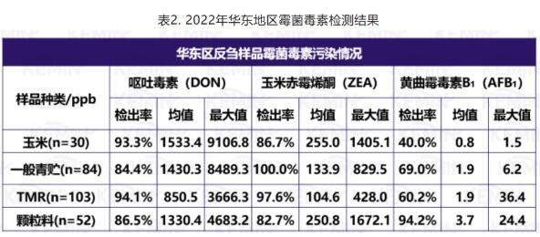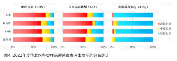 2022年反芻樣品主要來源于華東、華北兩個大區(qū),建明CLS按照華東區(qū)、華北區(qū)和其他區(qū)劃分區(qū)域進(jìn)行霉菌毒素污染分布的分析,結(jié)果顯示嘔吐毒素是各個地區(qū)各種主要樣品中廣泛存在的污染因素,需要重點關(guān)注;