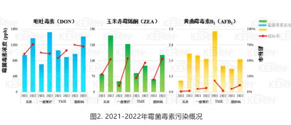 2022年玉米赤霉烯酮在各類樣品中的污染程度比2021年顯著提高。