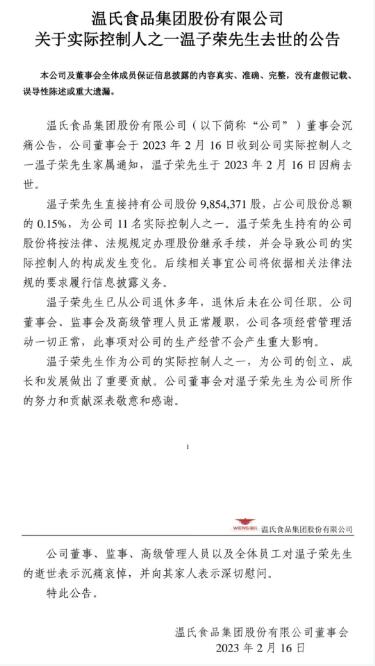 溫氏股份稱,溫子榮已從公司退休多年,未在公司任職。公司董事會、監(jiān)事會及高級管理人員正常履職,公司各項經(jīng)營管理活動一切正常,此事項對公司的生產(chǎn)經(jīng)營不會產(chǎn)生重大影響。