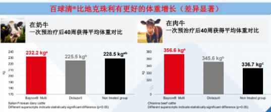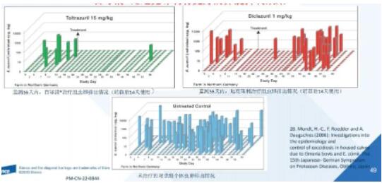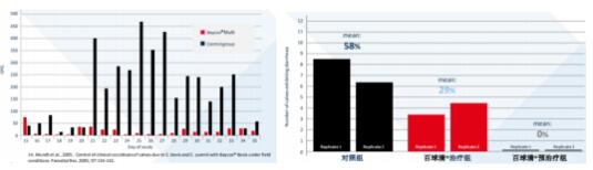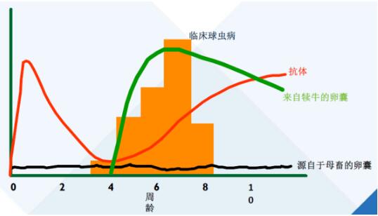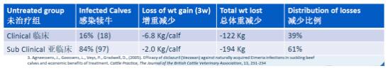 實(shí)驗(yàn)選取231頭3-16周齡(平均1.5個(gè)月)犢牛,分成2組,其中治療組116頭,未治療組115頭,治療組3周后監(jiān)測(cè)糞便卵囊生成和增重的情況。實(shí)驗(yàn)結(jié)果發(fā)現(xiàn),通過(guò)治療增重增加了20%,卵囊減少了99%,效果比較明顯。