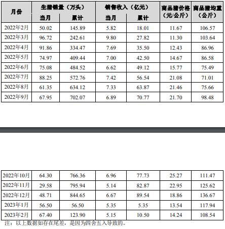 2023年1-2月,公司累計(jì)銷售生豬123.90萬頭,同比下降15.07%;累計(jì)銷售收入10.50億元,同比下降41.70%。