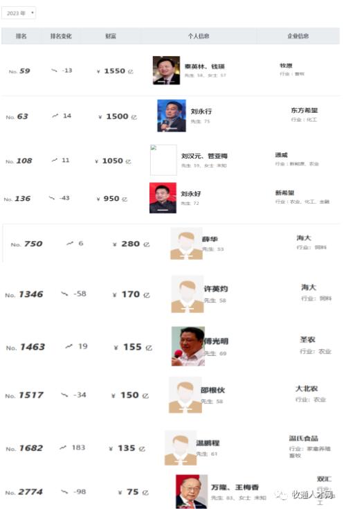 近日,胡潤研究院發(fā)布《2023全球富豪榜》,中國有13位農牧業(yè)企業(yè)家上榜,分別是牧原股份的秦英林夫婦、東方希望劉永行、通威股份劉漢元夫婦、新希望集團劉永好、海大集團薛華,許英灼、圣農集團傅光明、大北農集團邵根伙、溫氏食品溫鵬程以及雙匯集團萬隆夫婦。
