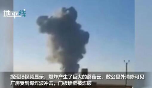 據(jù)現(xiàn)場(chǎng)視頻顯示,爆炸產(chǎn)生了巨大的蘑菇云,數(shù)公里外清晰可見。廠房受到爆炸波沖擊,門板墻壁被炸破。