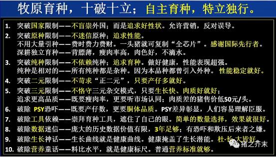 秦總在本次大會上提出了生豬育種的“十破十立”。雖然這并不是這一觀點的首次提出,但很多人誤以為這是牧原不做育種的表現(xiàn)。實際上,我們可以明顯地從看板的二級菜單看到“基因生產(chǎn)力”的概念,說明牧原只不過采用了不同的觀點和路線,并非不做育種。而且從另一個角度看,牧原關(guān)注種豬的性能、產(chǎn)仔、生長,用數(shù)據(jù)來指導(dǎo)經(jīng)營和育種。