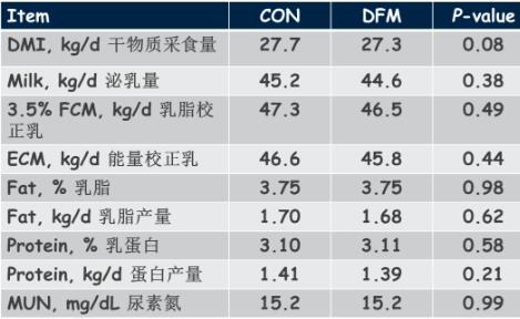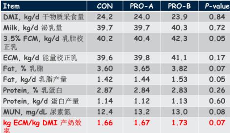 在本研究中有三組,一是對(duì)照組TMR,沒(méi)有直接飼喂微生物;二是PRO-A組,同樣的TMR,但添加了動(dòng)物乳桿菌和佛氏丙酸菌,它們是乳酸的生產(chǎn)者、消費(fèi)者和利用者。動(dòng)物乳桿菌可以產(chǎn)生乳酸,佛氏丙酸菌使用乳酸轉(zhuǎn)變成丙酸,讓動(dòng)物有更多能量,主要形式是提高肝臟里的血糖,有助于產(chǎn)奶;第三是PRO-B組,與對(duì)照組相同的日糧,但TMR表層添加動(dòng)物乳桿菌和佛氏丙酸桿菌、枯草芽孢桿菌、地衣芽孢桿菌等。結(jié)果顯示含有動(dòng)物桿菌的試驗(yàn)組,免疫指標(biāo)性能和效率都更高一些,這也是研究希望測(cè)試的細(xì)菌效果。