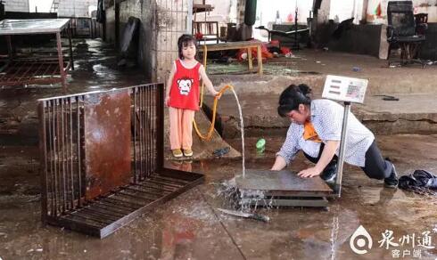 屠宰場(chǎng)關(guān)閉,一名小姑娘正乖巧地幫奶奶沖洗電子稱(chēng),準(zhǔn)備搬往它處。