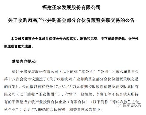 圣農(nóng)發(fā)展今天發(fā)布公告,公司擬以自有資金1.75億元收購(gòu)控股股東福建圣農(nóng)控股集團(tuán)有限公司(以下簡(jiǎn)稱“圣農(nóng)集團(tuán)”)、付雪平、趙筱蘭、李惠陽(yáng)等4名合伙人所持有的平潭德成農(nóng)牧產(chǎn)業(yè)投資合伙企業(yè)(有限合伙)(以下簡(jiǎn)稱“德成農(nóng)牧”“合伙企業(yè)”)合計(jì)77.698%的合伙份額。