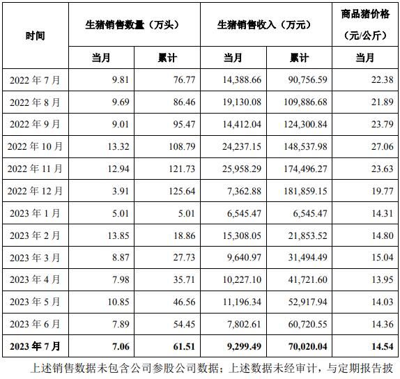 2023年7月生豬銷量合計(jì)7.06萬頭(其中商品豬4.90萬頭、仔豬2.06萬頭、種豬0.10萬頭),銷售收入合計(jì)9,299.49萬元,商品豬銷售均價(jià)14.54元/公斤,環(huán)比上升1.27%。