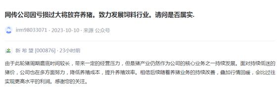 近日,新希望在回復(fù)投資者提問(wèn)時(shí)表示,由于此輪豬周期磨底時(shí)間較長(zhǎng),帶來(lái)一定的經(jīng)營(yíng)壓力,但是豬產(chǎn)業(yè)仍然作為公司的核心業(yè)務(wù)之一持續(xù)發(fā)展。面對(duì)持續(xù)低迷的豬價(jià),公司也在多方面努力,降低養(yǎng)殖成本,提升養(yǎng)殖效率。相信后續(xù)隨著養(yǎng)豬業(yè)務(wù)的持續(xù)改善,疊加行情回暖,會(huì)比過(guò)往實(shí)現(xiàn)更高水平的利潤(rùn)。