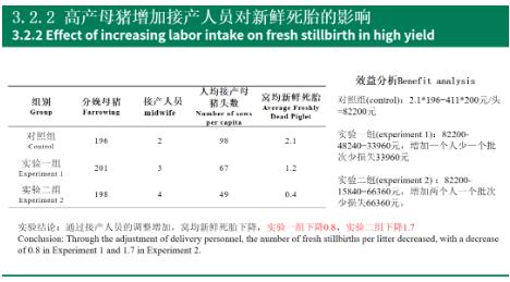 一個18天批的豬場,一批次分娩200頭母豬,且只有兩個人接產(chǎn),人均接產(chǎn)100頭母豬,該批次母豬產(chǎn)新鮮死胎頭數(shù)高達(dá)2.1頭。針對這一情況,余奎老師建議豬場成立接產(chǎn)小組,在母豬大產(chǎn)時增加1人,人均接產(chǎn)70頭,結(jié)果發(fā)現(xiàn)母豬產(chǎn)新鮮死胎數(shù)下降0.9頭;在原基礎(chǔ)上增加2人,人均接產(chǎn)50頭母豬,產(chǎn)新鮮死胎數(shù)下降1.7頭。說明增加接產(chǎn)人手有助于高繁母豬減少產(chǎn)新鮮死胎,更有利于豬場降本增效。