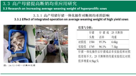 三、高產(chǎn)母豬提高斷奶均重應(yīng)用研究 仔豬一體化操作是指在母豬產(chǎn)后24-72小時一次性集中完成仔豬斷尾、閹割、補(bǔ)鐵等操作,減少第5天、第7天抓豬頻次和應(yīng)激,保證豬只健康生長;研究結(jié)果顯示通過仔豬一體化操作,對仔豬成活率沒有影響,仔豬25天斷奶重提高0.5kg。