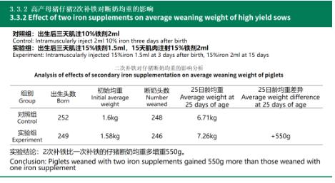 余奎老師提出“2+2補(bǔ)鐵技術(shù)”提高仔豬斷奶重的觀點,在仔豬出生后三天肌注15%鐵劑(血維素)1.5ml,15天肌肉再次注射15%鐵劑2ml,試驗結(jié)果顯示兩次補(bǔ)鐵比一次補(bǔ)鐵的仔豬斷奶均重多增重550g。