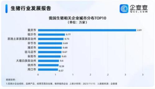 4、從城市來看:重慶現(xiàn)存養(yǎng)豬相關(guān)企業(yè)最多 企查查數(shù)據(jù)顯示,從城市來看,重慶現(xiàn)存2.81萬家生豬相關(guān)企業(yè)位居第一。臨沂、恩施分別現(xiàn)存0.77萬家、0.73萬家,位居前三。此后是畢節(jié)、濰坊、駐馬店等地。