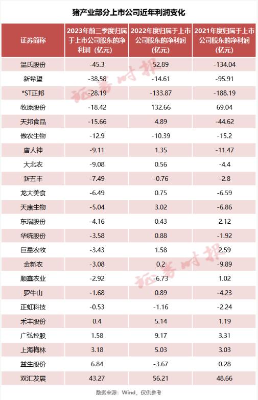 豬企在經(jīng)營上總體未能增收,直接導(dǎo)致了普遍虧損,但龍頭豬企體現(xiàn)出更強(qiáng)的風(fēng)險(xiǎn)抵御能力。據(jù)不完全統(tǒng)計(jì),在涉及養(yǎng)豬業(yè)務(wù)的逾20家A股上市企業(yè)中,多數(shù)企業(yè)今年前三季度虧損,該情形與2021年的情況比較類似。而在2022年,上市豬企大面積盈利,當(dāng)年度牧原股份盈利高達(dá)132.66億元,溫氏股份盈利達(dá)52.89億元。
