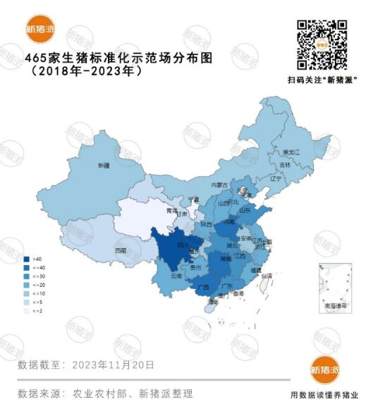截至2023年,有效期內(nèi)生豬示范場累計總數(shù)已達到465家。按照生豬能繁母豬存欄600頭以上,且年出欄育肥豬10000頭以上的遴選標(biāo)準,以最低標(biāo)準估算,465家示范場覆蓋超過能繁母豬27.9萬頭,大約占全國能繁母豬0.70%。