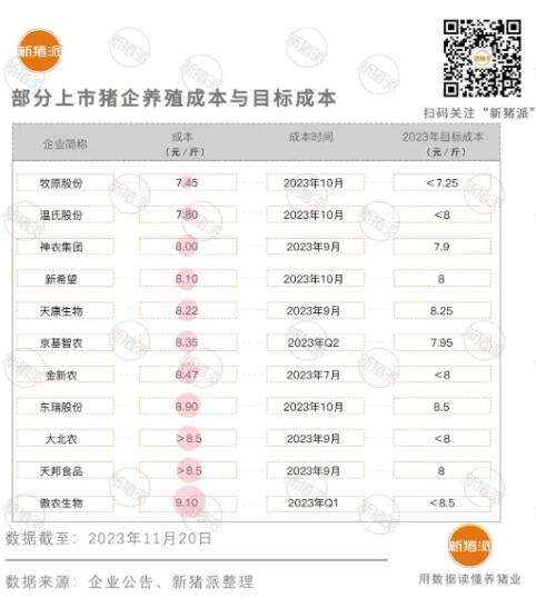 新豬派統(tǒng)計(jì)的11家豬企中,8家成本超過(guò)8元/斤,其中又有半數(shù)企業(yè)在8.5元/斤以上。