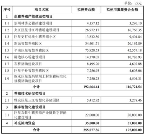 為彌補短板、促使養(yǎng)殖技術及管理水平進一步提升,本次發(fā)行募集資金將部分專項用于養(yǎng)殖技術研發(fā),在雅安市雨城區(qū)建設專業(yè)生豬養(yǎng)殖研究基地。巨星農牧稱,該項目建成后,有助于公司在基因育種、疫病防控、飼料配方、養(yǎng)殖效率、流程管理等諸多方面進一步提升科技和創(chuàng)新水平,為公司持續(xù)在全國建設高標準、規(guī)?;i養(yǎng)殖基地提供范本和技術支撐。