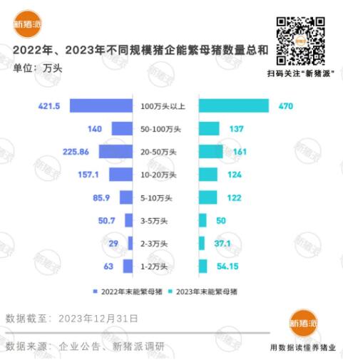 在疫病和行情的夾擊下,養(yǎng)豬企業(yè)核心工作圍繞降低成本、合理管控現(xiàn)金流而展開,以期在牌桌上還有一席之地。據(jù)新豬派統(tǒng)計,截至2023年底,全國能繁母豬超過1萬頭的企業(yè)共計118家,相較于2022年的120家減少2家。能繁母豬共計1155萬頭,占全國的28%。不僅是萬頭豬企數(shù)量減少,能繁母豬總數(shù)也較2022年的1176萬頭下降2%。
